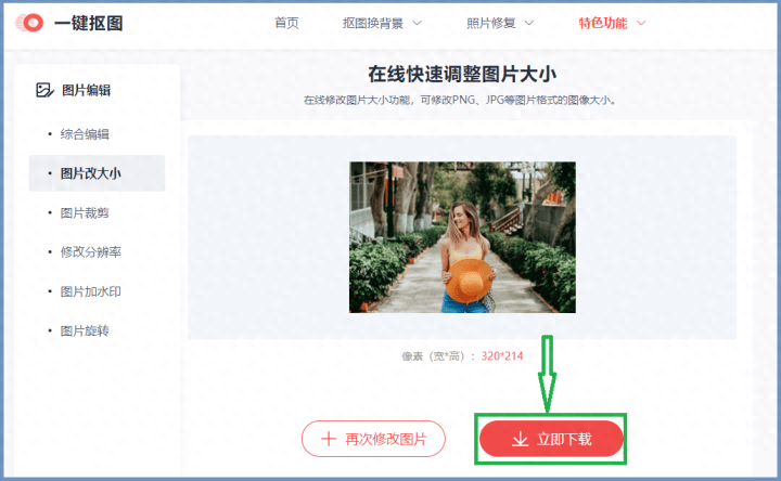 这里给大家演示一下网页端的操作,浏览器打开一键抠图,点击【图片编辑】-【图片改大小】。