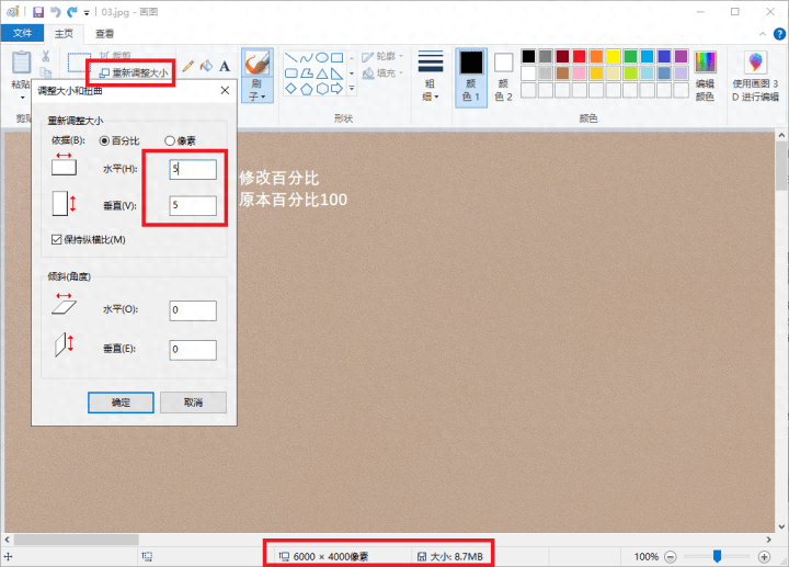 我们可以在打开后的页面下方看到图片原本的像素以及大小,点击【重新调整大小】将图片的水平、垂直百分比进行调整。