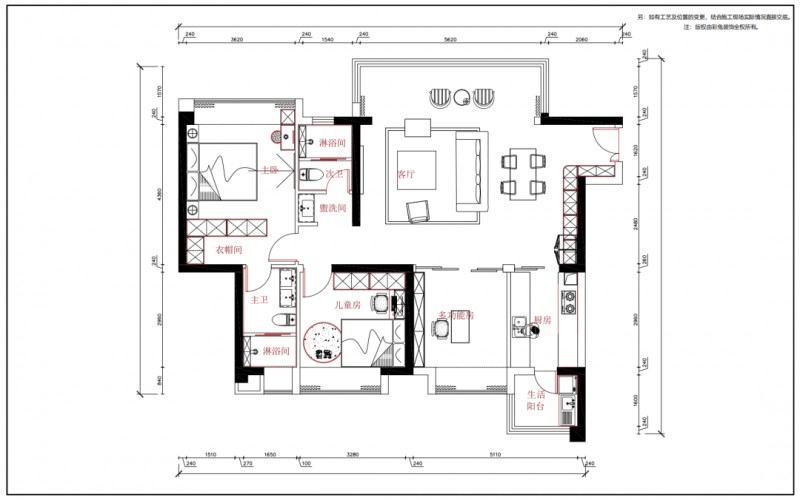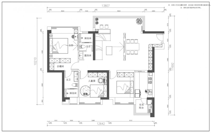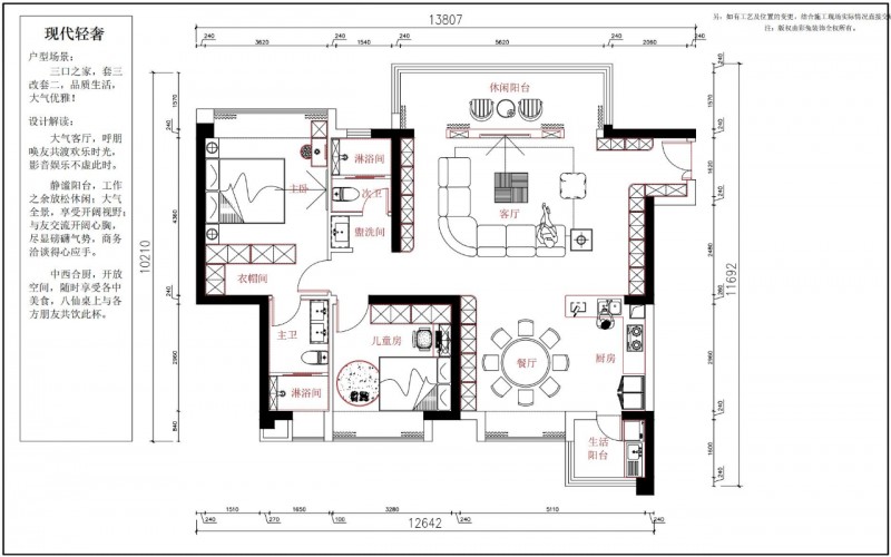 ① 三代同住,一孩家庭,需要三个卧室,原始户型未做大的改动,主要改造点在家居动线与细节设计,因为有生活阳台,南阳台不需要承担洗衣功能,因此依托沙发做小吧台,休闲有情调。