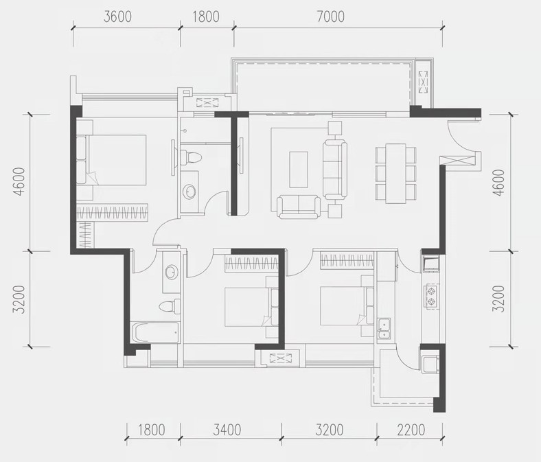✘缺点:厨房有些许狭长,餐厅位置相对客厅有些许偏移,客卫干湿不分明,主卫洗漱台使用不够充分。