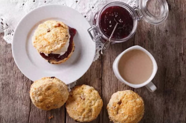 是一种英式奶油茶点,标配是凝脂奶油,草莓酱,司康饼,和一杯英式红茶。
