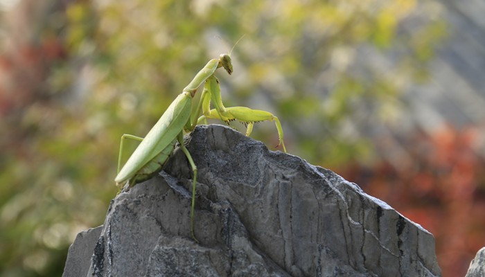 螳螂是属于有翅亚纲螳螂科下的一种动物,是一种中至大型昆虫,头呈三角形,活动自如,前足腿节与胫节有利刺,胫节呈镰刀状,常向腿节折叠,形成可以捕捉猎物的前足,前翅皮质,为覆翅;后翅膜质,臀域发达,呈扇状;休息时会叠在背上,腹部较为肥大。