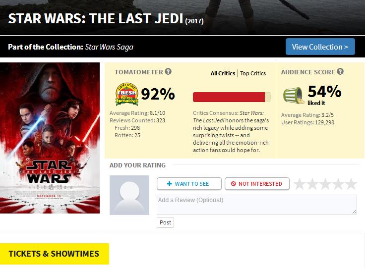 那么它的评分到底代表什么?比如说一部电影的烂番茄上面是98分,就代表100个影评人里面有98个人喜欢这部电影,并不是说这部电影所得到平均分数是98分。而超过60分的就是“新鲜”,60分以下就是“腐烂”,这个评价系统的问题在于它往往无法呈现一部电影的整体评价。因为它只有喜欢和不喜欢,常常让分数呈现非常极端的状态。
