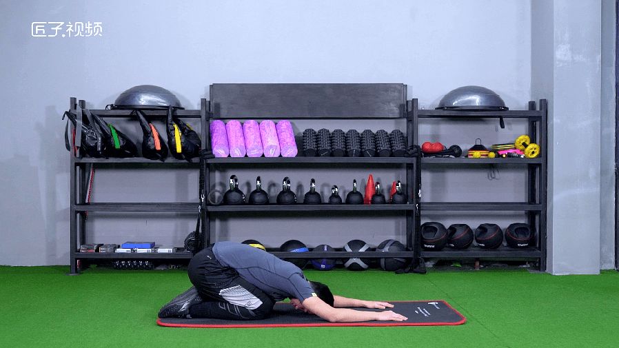 在瑜伽垫上俯身,把我们的臀部往小腿方向坐去,上半身保持放松低头,让整个背部得到放松。