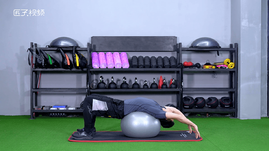 首先我们准备一张瑜伽垫和健身球,然后把健身球放到腹部下方,双脚踩住垫子,手向上延伸,保持腹部有拉伸感;