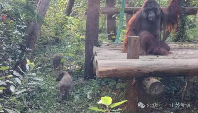 除了高黎贡展区,在红山森林动物园的其他展区也有物种混养的情况,比如打工小野猪在猩猩馆翻地。