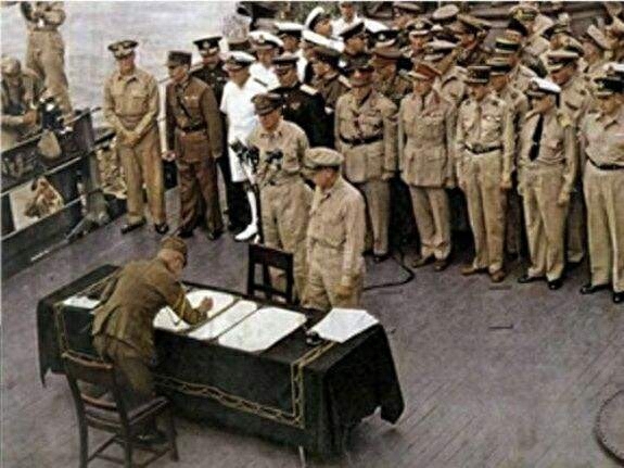 1945年8月15日,日本天皇向全日本广播,接受波茨坦公告、无条件投降。1945年9月2日,日本投降签字仪式在东京湾的密苏里舰举行。
