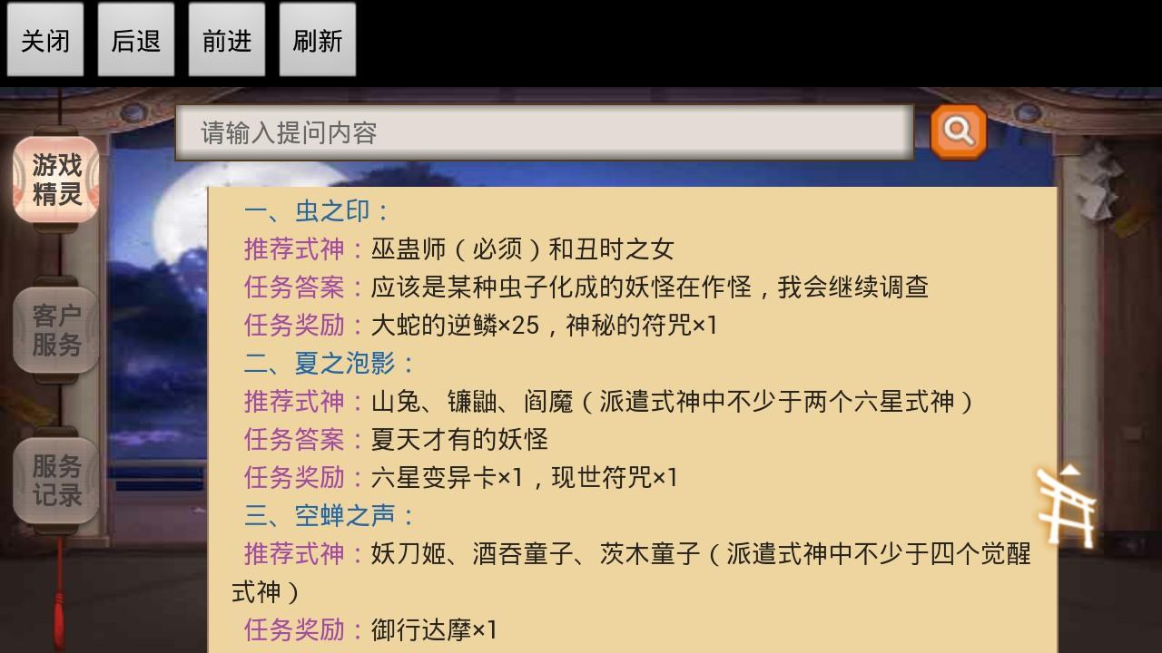其实,虫之印任务在网易精灵里也有提示,所以大家在遇到任务的时候直接去虫之印更方便。这次任务需要用到的式神大家可以稍微记下,有空就把等级提上去。这个系列的任务相比鸟之羽的任务要求会高一些,需要用到妖刀茨吞还是阎魔等SSR式神,感觉对于平民不是很友善啊!