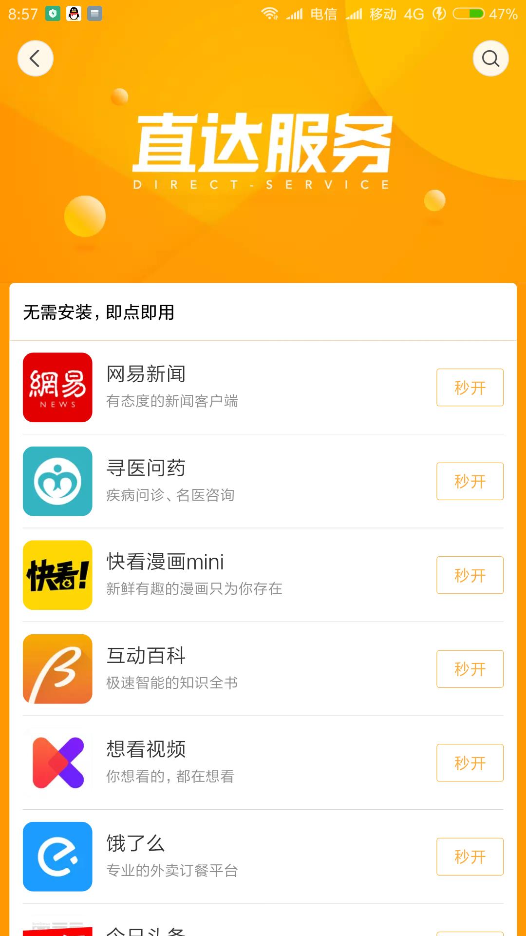 不过这一切现在就可以改变了,因为直达服务的意思就是可以直接进入APP,而不需要下载,不需要安装,不占用手机内存。怎么样,很酷是不是。使用方法也特别的简单。如下: