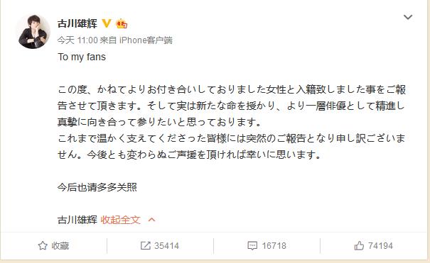 今日,日本男星古川雄辉在自己微博上发布消息,称很抱歉这么突然用这种方式向粉丝们告知:自己已经和一位一直在交往的女性喜结连理,想尝试"接受新的生命";并表示作为演员未来会更加认真的去面对,如果能够继续得到粉丝们的支持表示十分荣幸。
