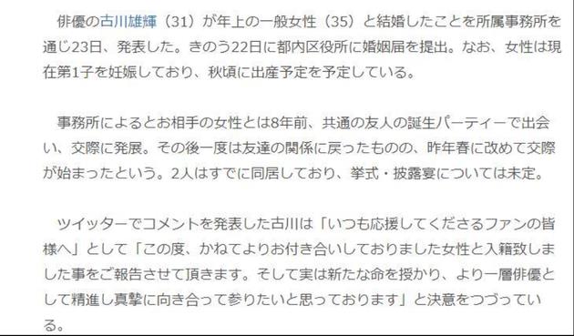 紧随其后的日媒报道中称,6月22日,古川雄辉和圈外女友向区役所提交了结婚申请,目前女方已经怀孕,预产期预计在秋天。而后古川雄辉所在事务所也表示,称两人早在八年前的朋友聚会上面认识后,开始尝试交往的,期间两人恢复过一段时间的朋友关系,但在去年春天又开始了正式的交往。