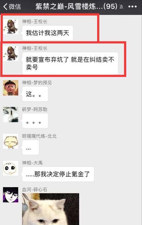 同时,也有人爆料出风雪楼公会微信截图,王校长说已经要宣布弃坑了,只是在考虑是否卖号。