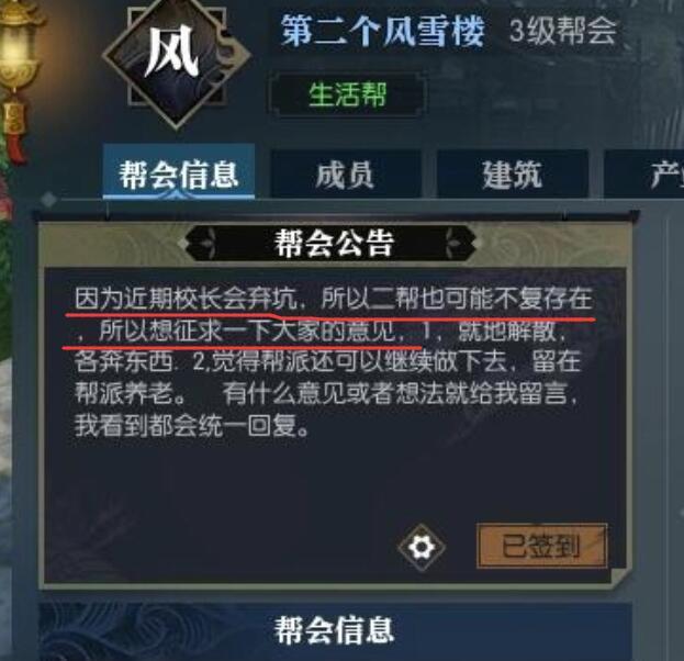 有网友爆料说王校长准备弃坑,并附带出紫禁之巅服务器中,王校长所在风雪楼二帮的公告,上面写着,王校长最近考虑弃坑,想询问一下各位帮众是散帮还是继续发展这一情况。