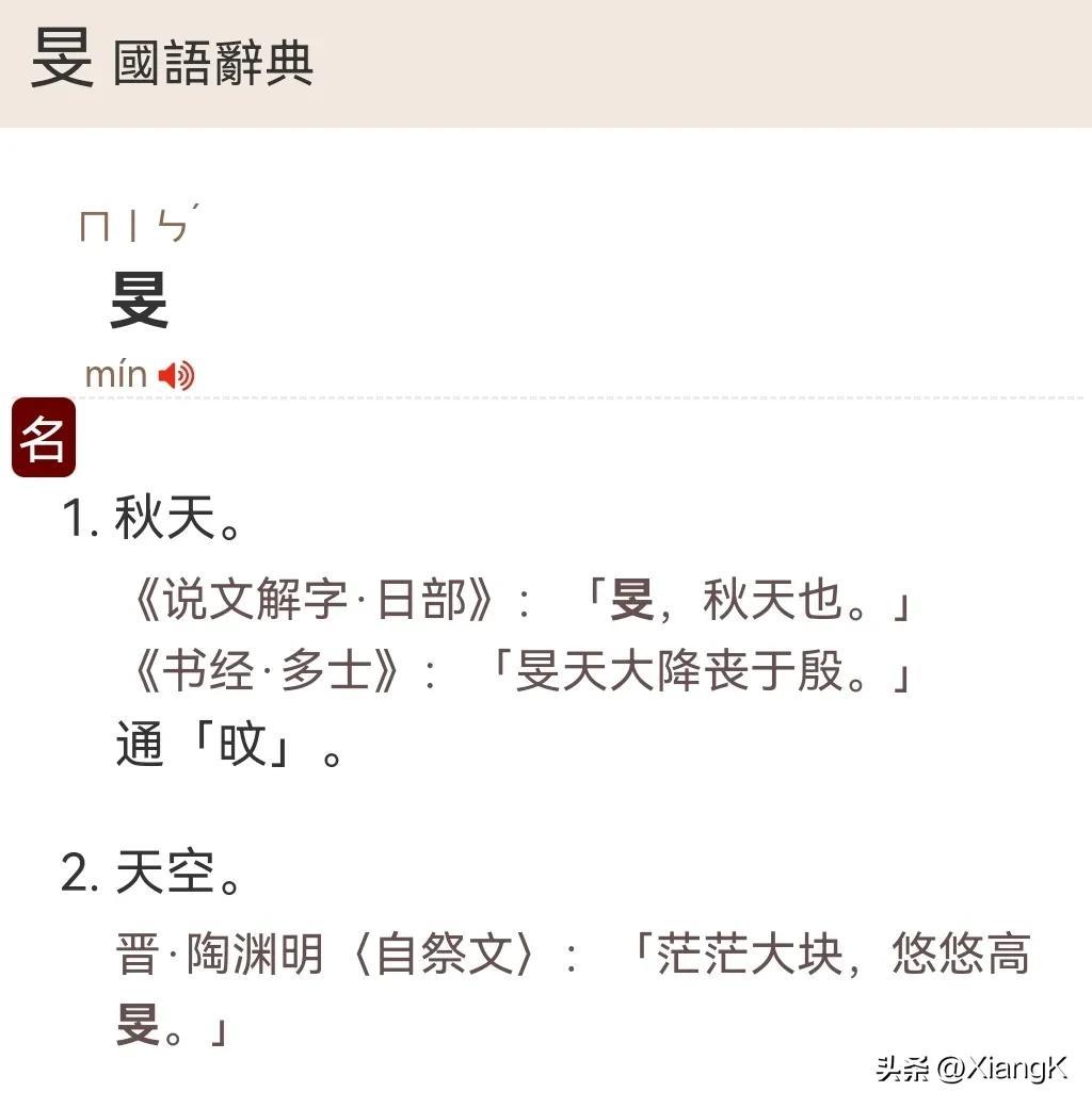 “旻”字主要用来指天,特别是天空,更精确地说,它指的是秋季的天空。