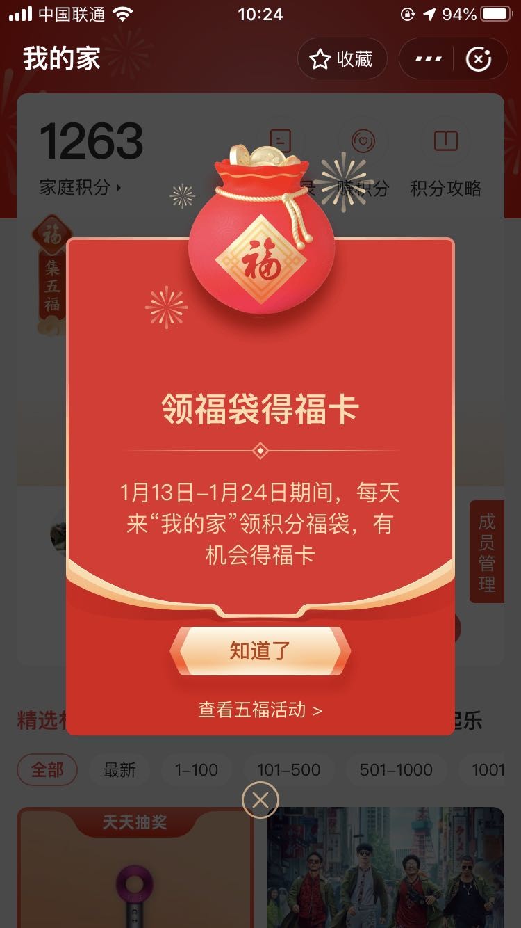 3.支付宝APP→最上方搜索框中输入“我的家”→领积分即可获得福袋,可领福卡