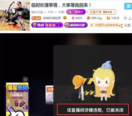 但不料转眼间又过了三天,粉丝们不仅没有等到蛇哥,而且在今天发现:蛇哥直播间目前显示:“该直播间涉嫌违规,已被关闭”等字样!