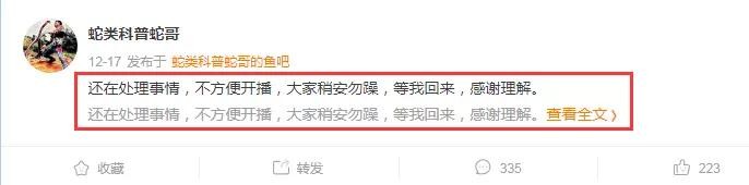 12月17日,蛇哥更新动态称:我最近还在处理事情,所以暂时不方便开播,大家稍安勿躁!谢谢你们的理解!当时大伙见状纷纷表示理解并直言“等你回来”!