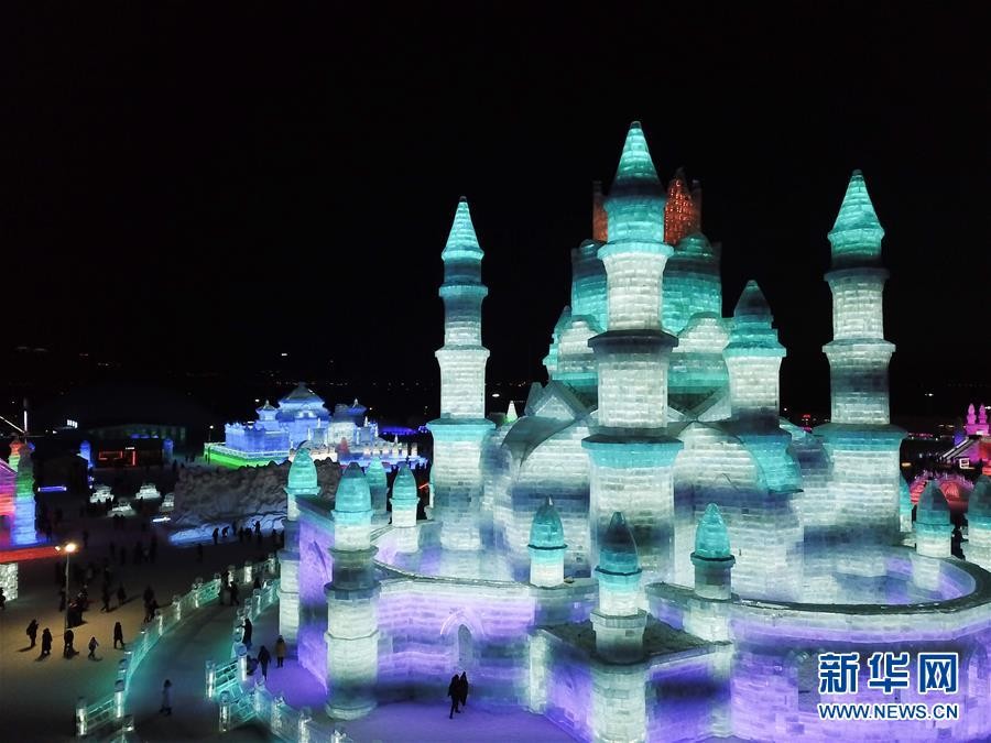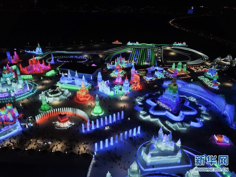 1月5日无人机拍摄的第35届中国·哈尔滨国际冰雪节主会场之一哈尔滨冰雪大世界园区。 新华社记者 王松 摄