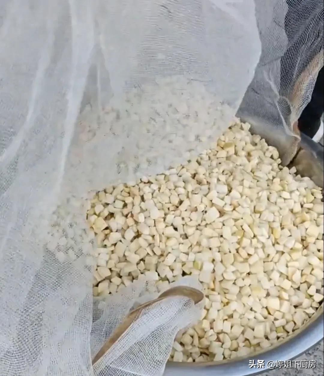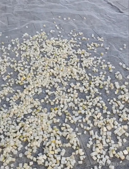 咱们准备地里新鲜的大白萝卜,切成小方丁,加入大量的盐来去除它的辛辣味儿。但是盐也不要太多了,因为后期咱们还要加很多的调料,咱们找个干净的地方晾干。