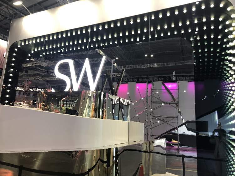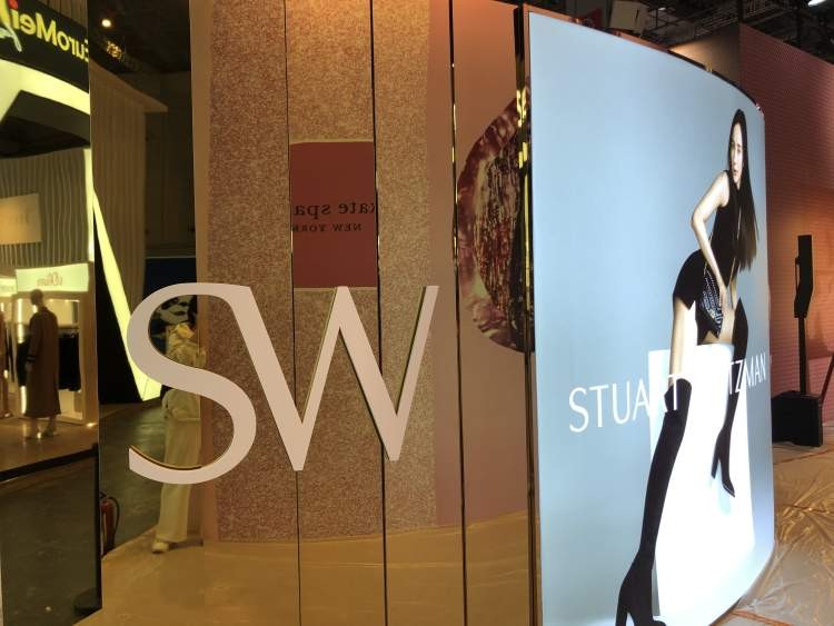 周到君在现场看到,SW展台已基本就位。主打颜色为品牌鞋盒的标志蓝加上一点金色,凳子也采用了标志蓝色。巨幅广告上的明星穿的正是其王牌产品:靴子。