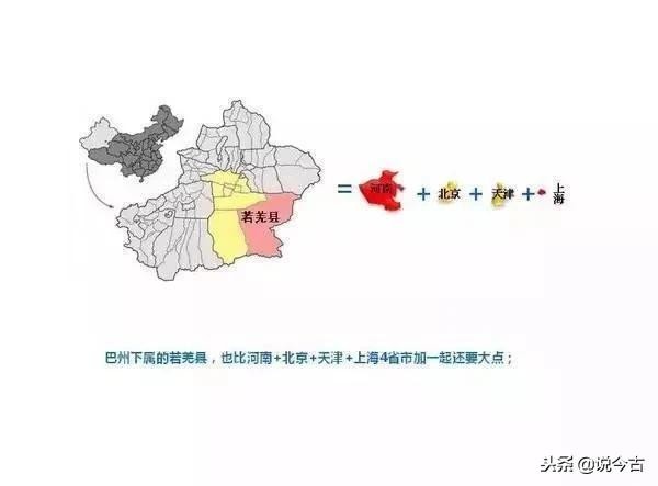 就连巴州下属的若羌县,也比河南 + 北京 + 天津 + 上海 4 省市加一起还要大点。