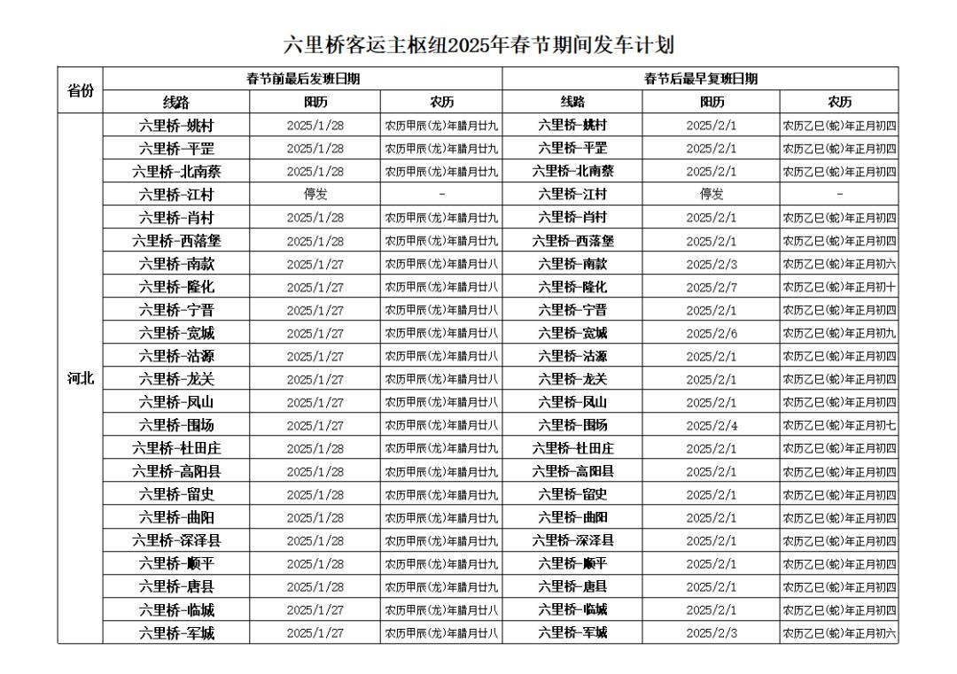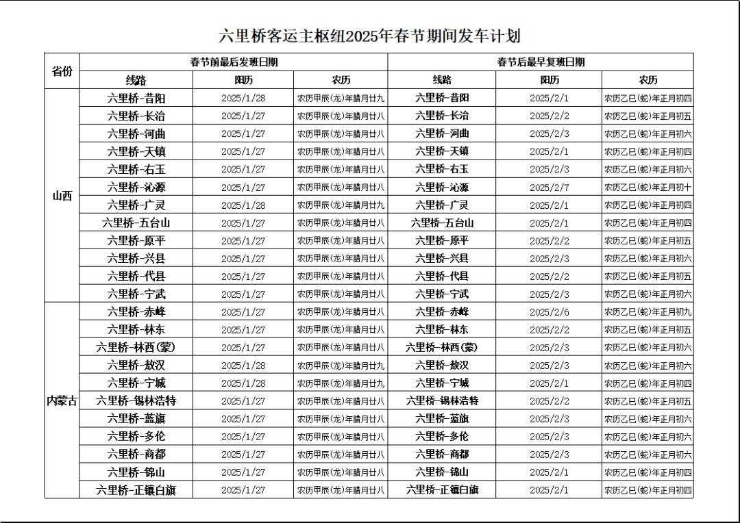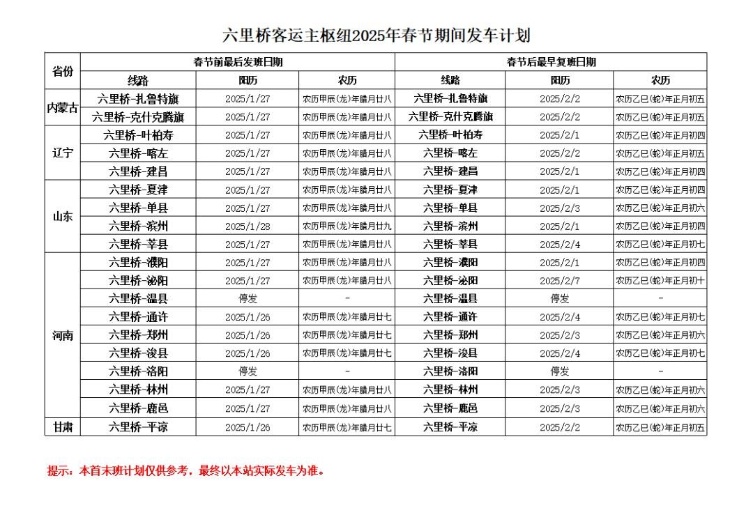 班线春节前、后首末班计划