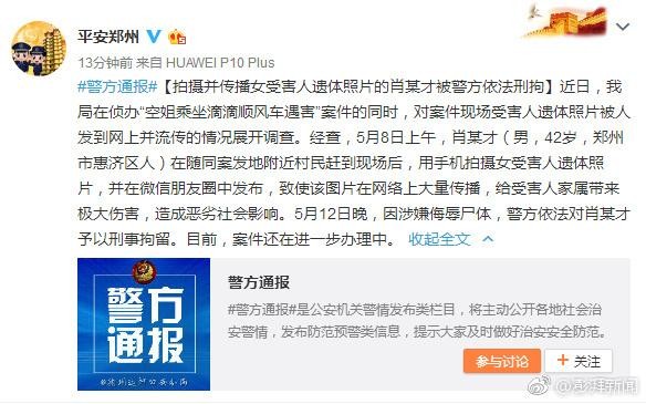 据@平安郑州 通报:近日,郑州市公安局在侦办“空姐乘坐滴滴顺风车遇害”案件的同时,对案件现场受害人遗体照片被人发到网上并流传的情况展开调查。经查,5月8日上午,肖某才(男,42岁,郑州市惠济区人)在随同案发地附近村民赶到现场后,用手机拍摄女受害人遗体照片,并在微信朋友圈中发布,致使该图片在网络上大量传播,给受害人家属带来极大伤害,造成恶劣社会影响。5月12日晚,因涉嫌侮辱尸体,警方依法对肖某才予以刑事拘留。目前,案件还在进一步办理中。