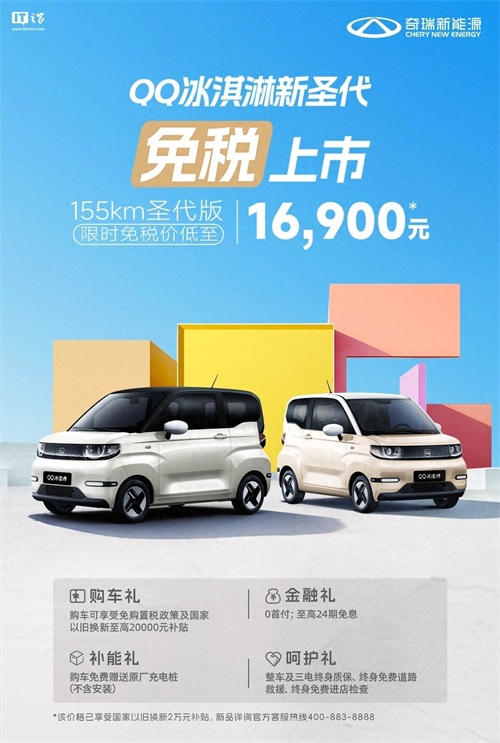 IT之家 11 月 25 日消息,奇瑞新能源今日宣布,旗下 QQ 冰淇淋新增“新圣代”车型,官方指导价 3.69 万元,限时免税价 1.69 万元(IT之家注:含国家以旧换新 2 万元补贴)。
