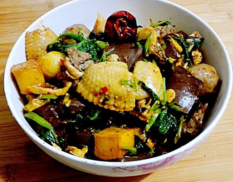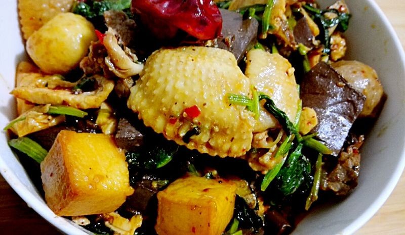 五香油100ml、郫县豆瓣(剁碎)2汤匙(30ml)、火锅调料50克、干辣椒80克姜片15克、大蒜20克、葱段15克、料酒1汤匙(15ml)、糖2茶匙(10ml)、盐酌情添加、鸡精少量、白芝麻适量、香菜适量