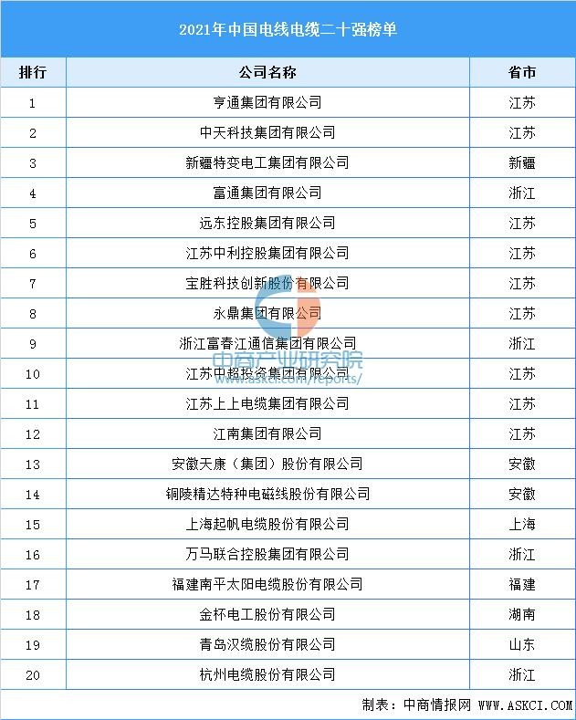 中商情报网讯:近日,中国制造企业协会公布了“2021年中国电线电缆二十强榜单”,榜单参照国际上通行的做法,以2020年企业营业收入为基本标准,综合参考企业的其他条件。亨通集团有限公司、中天科技集团有限公司、新疆特变电工集团有限公司等企业入选榜单。