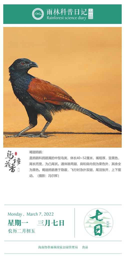 是鸦鹃科鸦鹃属的中型鸟类,体长40~52厘米,嘴粗厚,呈黑色,尾长而宽,为凸尾状。通体除两翅、肩和肩内侧为栗色外,其余全为黑色。褐翅鸦鹃善于隐蔽,飞行时急扑双翅,尾羽张开,上下摆动。(摄影:冯尔辉)