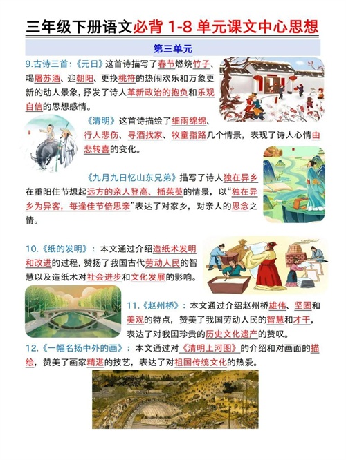 三年级下册语文必背1-8单元课文中心思想