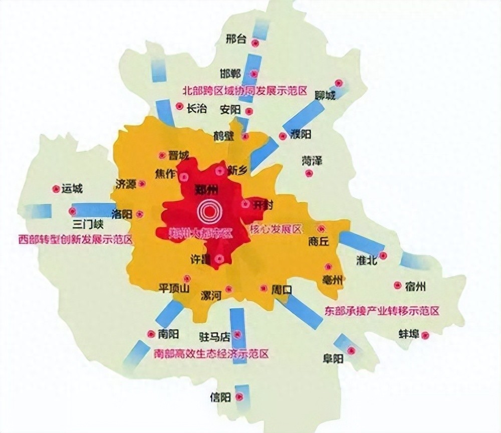 中原城市群(西郑城市群):2016年国家发改委印发《中原城市群发展规划》。提出:促进中部崛起,将中原城市群,建设成为中国经济发展新增长极。以郑州为中心,洛阳、开封为副中心,许昌、新乡、焦作、平顶山、漯河、济源等9座地级市为核心层所构成的具有高度紧密社会经济联系的城市群。