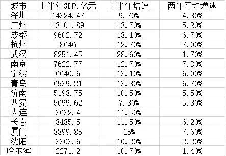 15个副省级城市中,深圳和广州作为一线城市,上半年GDP都超过了1.3万亿元。