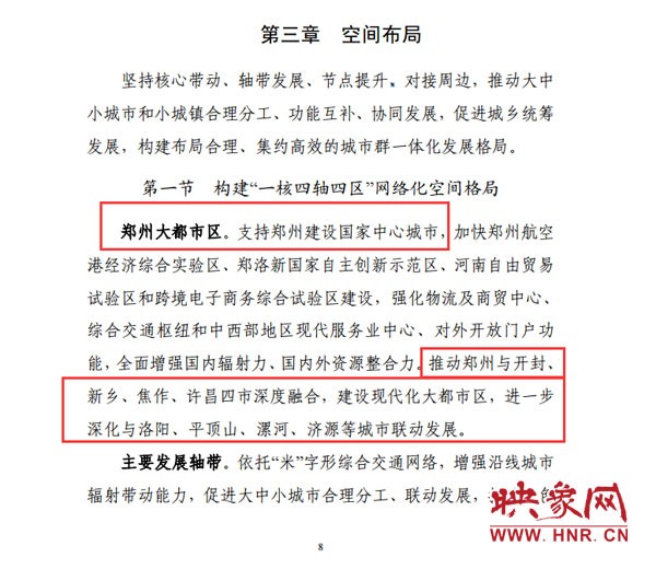 《规划》中表示,支持郑州建设国家中心城市,加快郑州航空港经济综合实验区、郑洛新国家自主创新示范区、河南自由贸易试验区和跨境电子商务综合试验区建设,强化物流及商贸中心、综合交通枢纽和中西部地区现代服务业中心、对外开放门户功能,全面增强国内辐射力、国内外资源整合力。推动郑州与开封、新乡、焦作、许昌四市深度融合,建设现代化大都市区,进一步深化与洛阳、平顶山、漯河、济源等城市联动发展。
