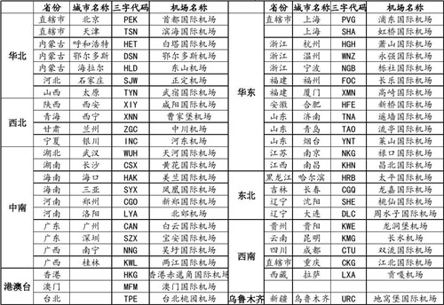 全国各地主要城市机场名称和三字代码名录!