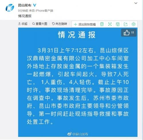 3月31日上午7:12左右,昆山综保区汉鼎精密金属有限公司加工中心车间室外场地上存放废金属的一个集装箱发生一起燃爆,引起车间起火,导致7人死亡, 1人重伤,4人轻伤。截止上午10时许,事故现场清理完毕。事故原因正在调查中。事故发生后,苏州市委市政府、昆山市委市政府主要领导和分管领导,第一时间赶赴现场指导救援和事故处置工作。