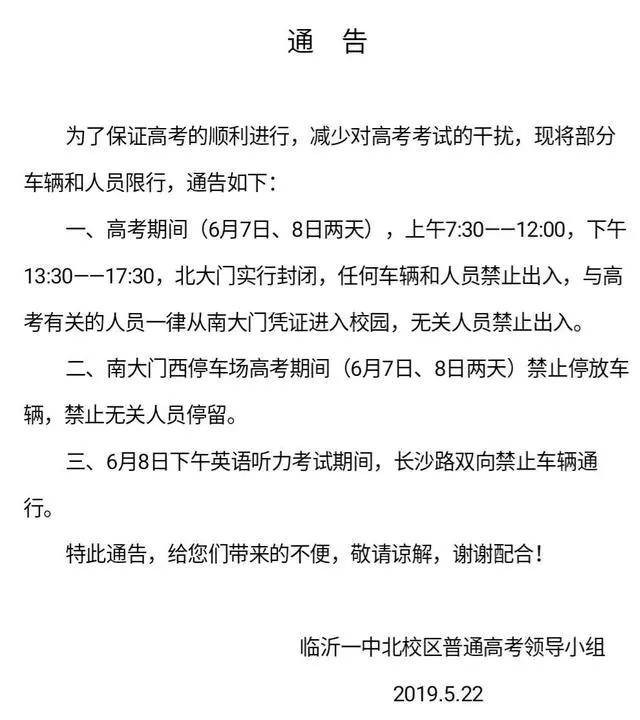 根据通告,高考期间(6月7日、8日两天),临沂一中北校区北大门实行封闭,南大门西侧停车场禁止停放车辆。同时,6月8日下午英语听力考试期间,长沙路双向禁止车辆通行。