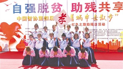5月11日,在第二十九次全国助残日到来之际,由青海省残疾人联合会、青海慧灵智障人士工作服务站、“春之语”志愿者服务社等单位共同开展的“自强脱贫、助残共享”为主题的大型公益活动,2019年全国助残日“牵着蜗牛去散步”红色之旅暨2019“大福·快跑”活动在市新宁广场隆重举办。图为手语舞《跪羊图》。本报记者 魏雅琪 摄