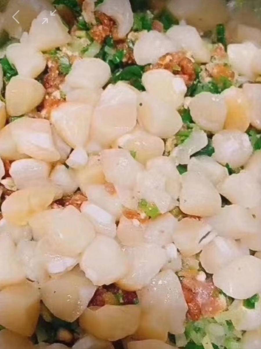 本大厨公开独创配方:生扇贝丁。注意扇贝丁不要切碎,数量上满足一个饺子包两、三个扇贝丁。