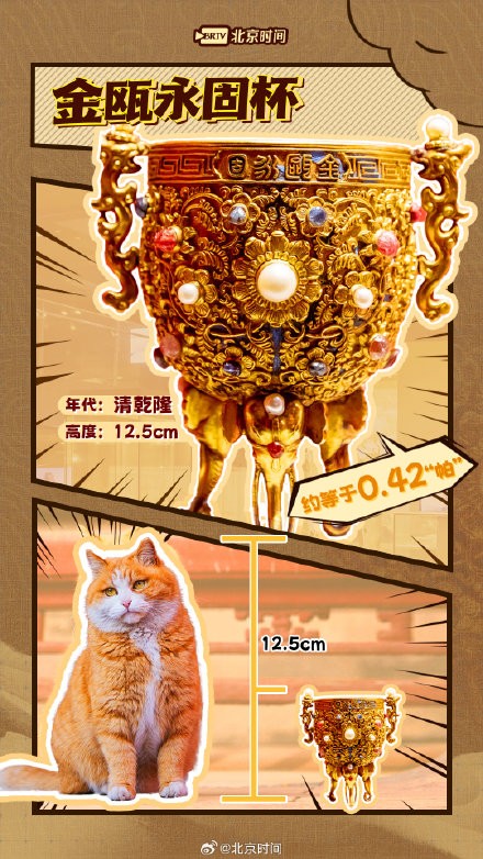 金瓯永固杯、瓷母、莲鹤方壶……它们的真实大小是多少?为了让大家对故宫这些馆藏瑰宝有更具体的理解,故宫猫“帕帕”挺身而出,采用“顾全大橘”测量法:已知帕帕的坐姿身高约为30厘米,可得金瓯永固杯为0.42“帕”,玉龙为0.85“帕”,莲鹤方壶为4.07“帕”……这一刻,故宫文物有多大一下子具像化了!
