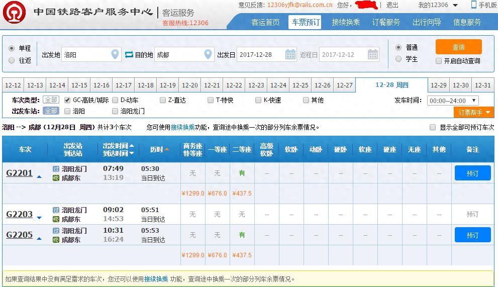 12月12日上午,记者查询12306官方售票平台看到,从洛阳到成都的直达高铁于28日开通,开始售票!
