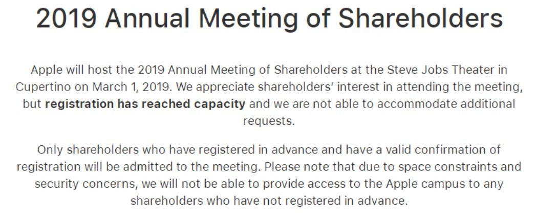 苹果去年首次在史蒂夫·乔布斯剧院举行年度股东大会,这一趋势将在 2019 年延续下去。由于史蒂夫·乔布斯剧院的座位有限,苹果要求股东提前登记。(校对/Oliver)