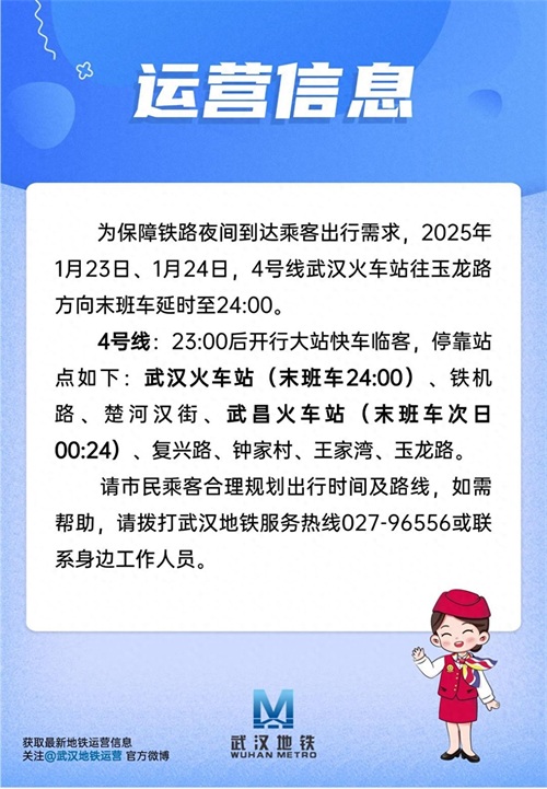刚刚,极目新闻记者从武汉地铁运营公司了解到,为保障铁路夜间到达乘客出行需求,1月23日、1月24日两天,地铁4号线武汉火车站往玉龙路方向末班车延时至24:00。