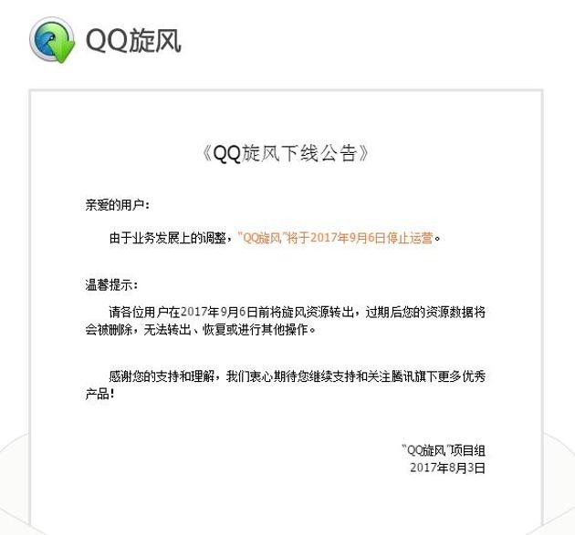 成都全搜索新闻网8月4日讯 腾讯旗下下载工具QQ旋风昨日发布公告称,由于业务发展上的调整,将于2017年9月6日停止运营。并提醒用户在2017年9月6日前将旋风资源转出,过期后资源数据将会被删除,无法转出、恢复或进行其他操作。
