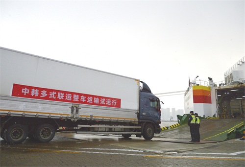 12月19日,中韩两国在威海-仁川试运行多式联运整车运输,首辆承担整车运输任务的货车满载中国跨境电商货品,在山东威海港登上客货班轮,准备赴韩。(新华社)
