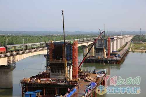 昌吉赣高铁泰和赣江特大桥,桥长6.839公里,共203跨,主桥416米,主跨160米,最深水位达17米,与京九线相距33米,是昌赣高铁三跨赣江特大桥之一,是全线重难点控制性工程之一。泰和赣江特大桥自2015年启动以来,工程整体进展顺利,目前已经完成墩身、装机等建设任务,主体工程顺利完工,正在进行主跨现浇梁施工。