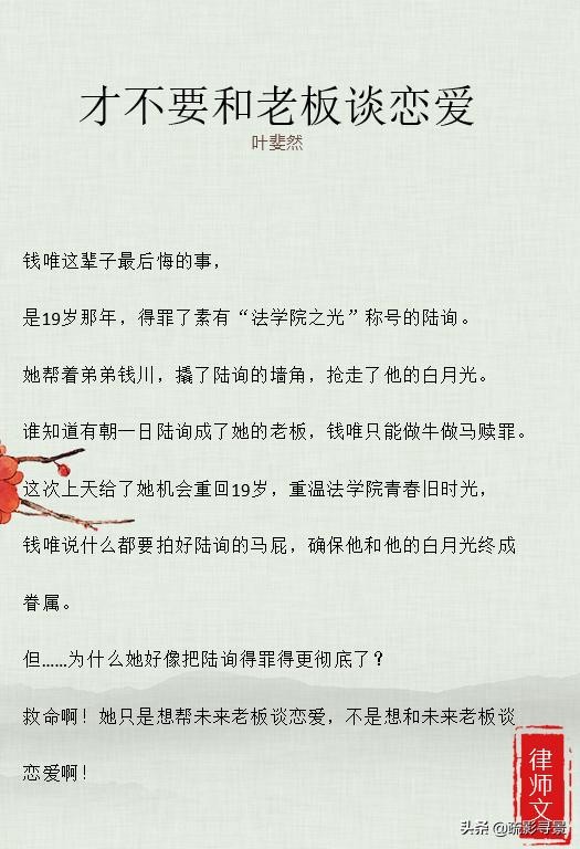 叶斐然的《才不要和老板谈恋爱》法学院高岭之花学霸男主VS狗腿成精古灵精怪女主,法学生VS法学生,今日说法般的恋爱体验。