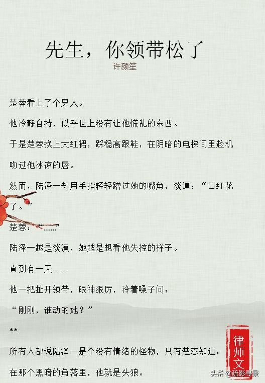 许颜笙的《先生,你领带松了》高冷禁欲系律师 VS 社会一姐, 倒追,甜宠,女主骄纵,可强可弱,玩的了刀撒的了娇;男主前期压制情感,自控力超强;女主游戏策划师,男主律师,1V1,HE。