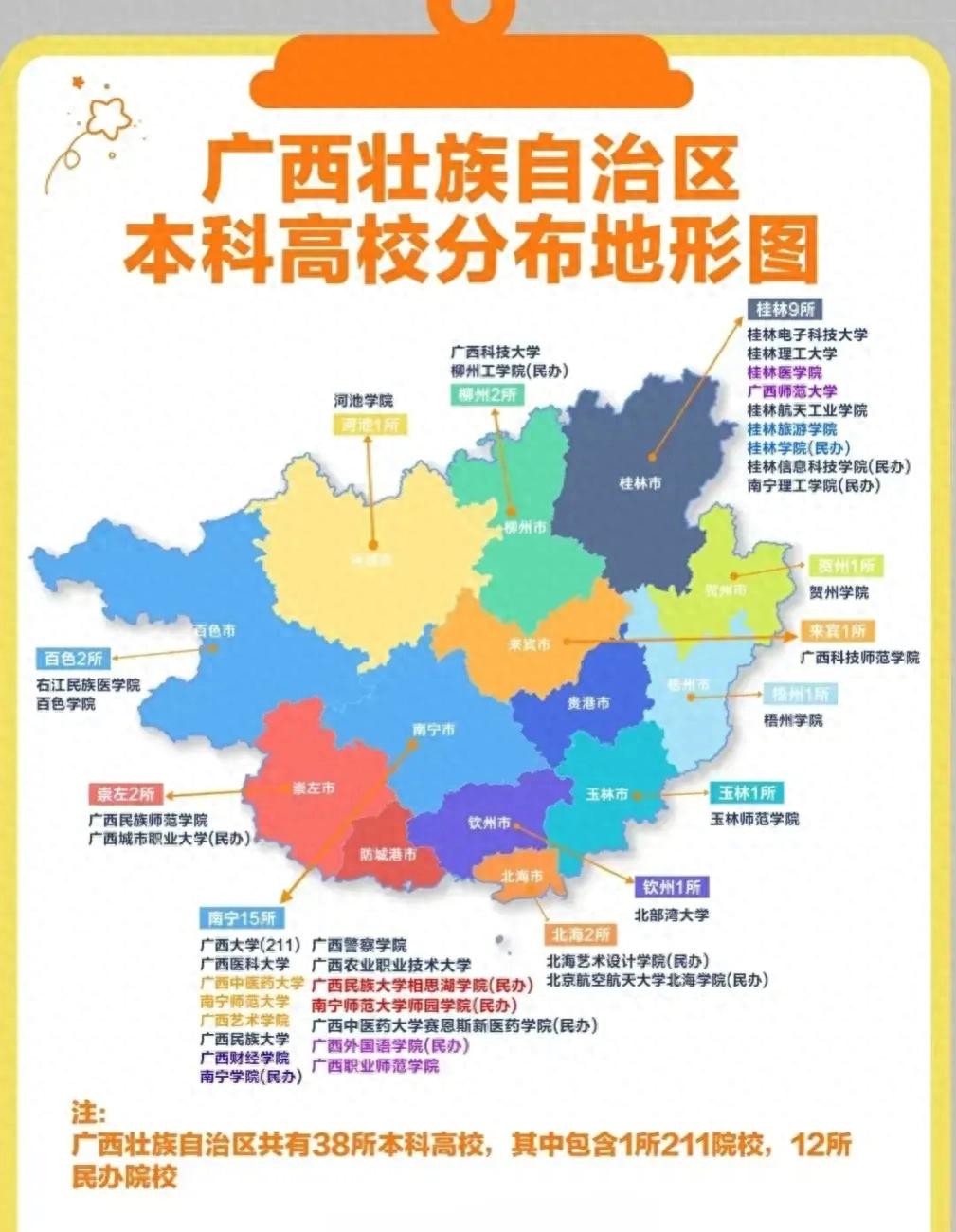 广西的公办院校集中在南宁和桂林,其他一地市基本保证了一所高校。